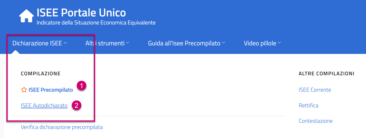 - Acquisizione on-line della Dichiarazione Sostitutiva Unica: seleziona tra la ISEE Precompilato (1) o ISEE Autodichiarato (2), per fornire i dati necessari al calcolo dell’indicatore;